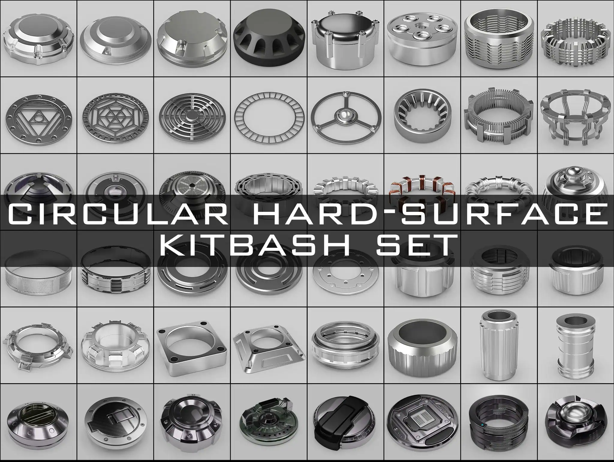 Circular hard-surface kitbash set – モデラーの星野 昇平氏が48個の円形ハードサーフェス・キットバッシュモデルをGumroad上で無料配布しています!商用利用可!